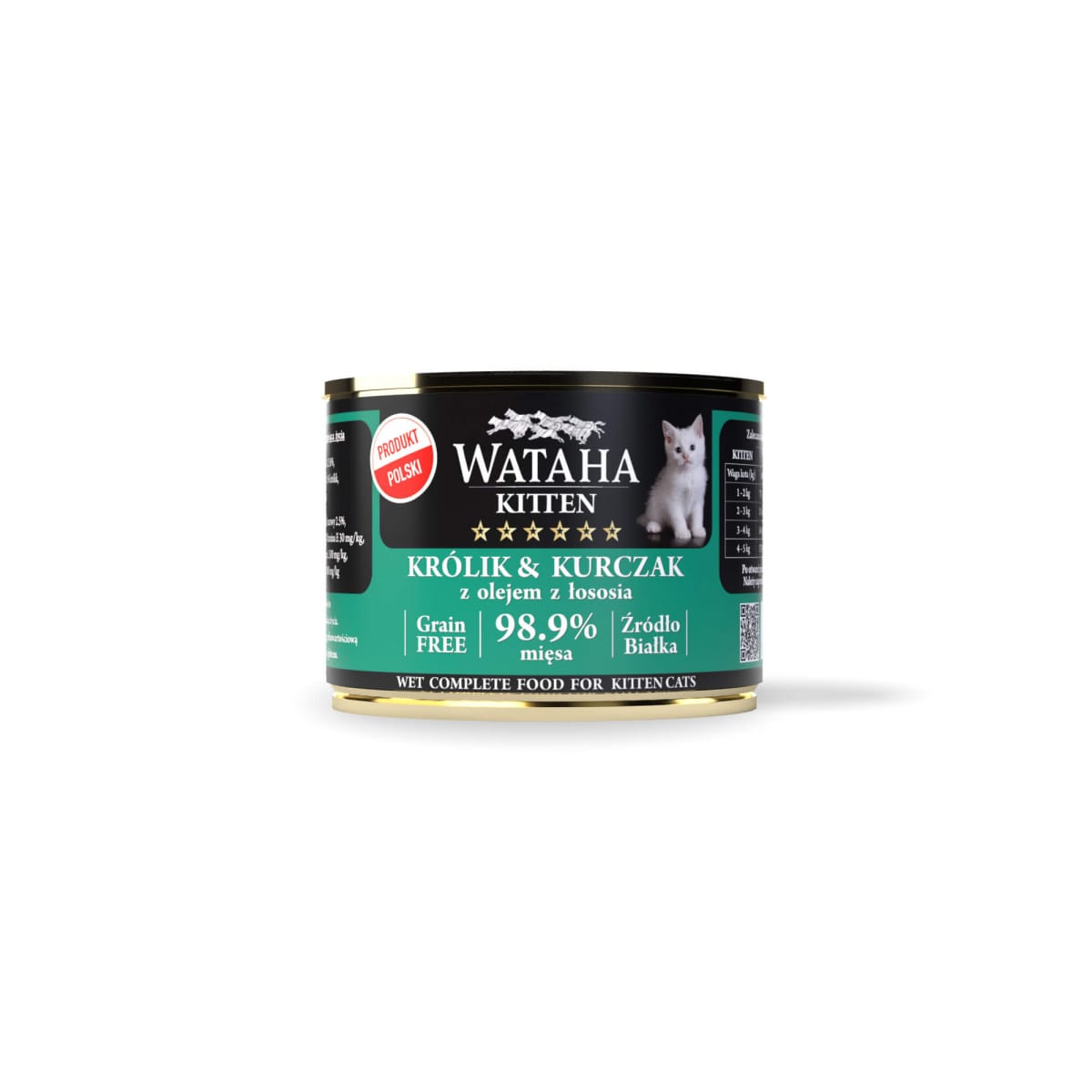 Wiemy, że jakość karmy jest ważna, dlatego w naszych produktach staramy się zawrzeć wszystko, co najlepsze. Składniki w naszych karmach pochodzą od lokalnych hodowców i właścicieli upraw. Mokra karma Wataha HUNT Królik & Kurczak z Olejem z Łososia dla kociąt to aż 98,9% mięsa. Witamina A, D i E odpowiadają za ostry wzrok, piękną sierść, mocne kości, przyczyniają się do prawidłowej pracy układu pokarmowego, immunologicznego oraz nerwowego, działają antyoksydacyjnie. Olej z łososia jest źródłem kwasów tłuszczowych, które biorą udział w procesach metabolicznych w organizmie kota, wspierają odporność, a także korzystnie wpływa na stan sierśći czworonogów. Są też odpowiedzialne za obniżanie cholesterolu we krwi czy pomagają w leczeniu chorób skórnych. Ponadto, mokra karma zapewnia kotu odpowiednią ilość płynów, dzięki wysokim poziomie wilgotności produktu. Dzięki naszej karmie Twój kot otrzyma potrzebne składniki odżywcze, bez sztucznych konserwantów, barwników i wzmacniaczy smaku.